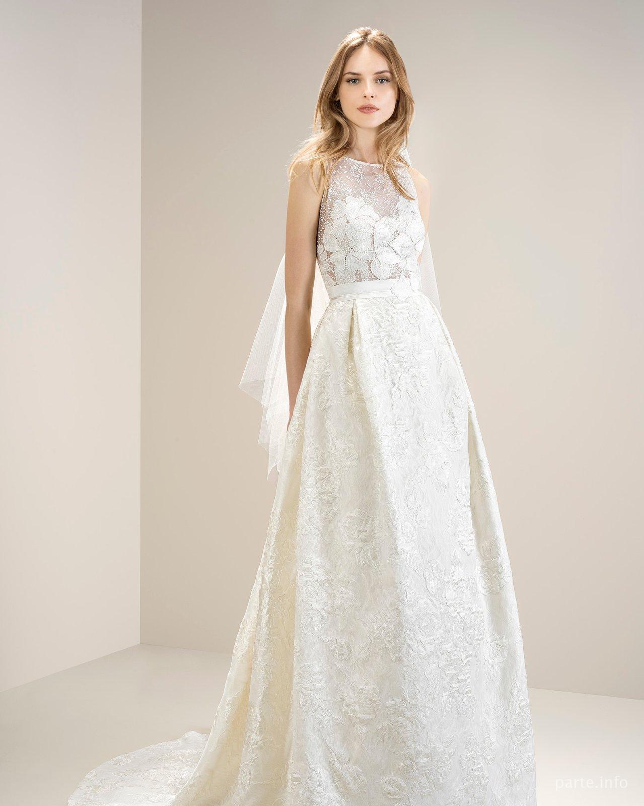 Дизайнерское свадебное платье А-силуэта, с объемными флористическими мотивами из благородной порчи цвета айвори.